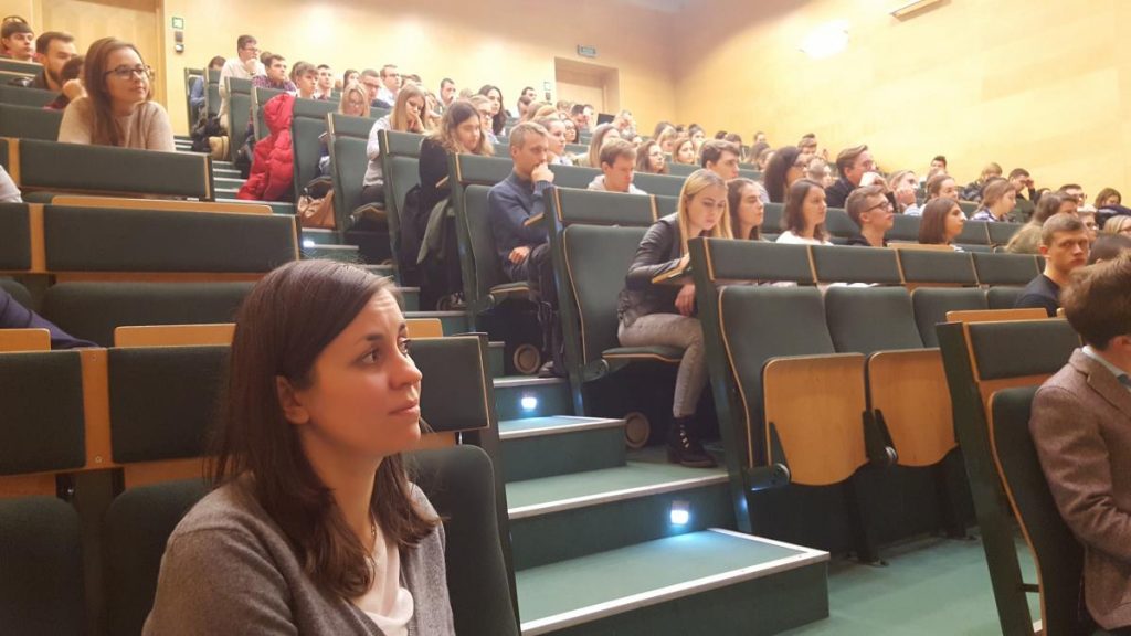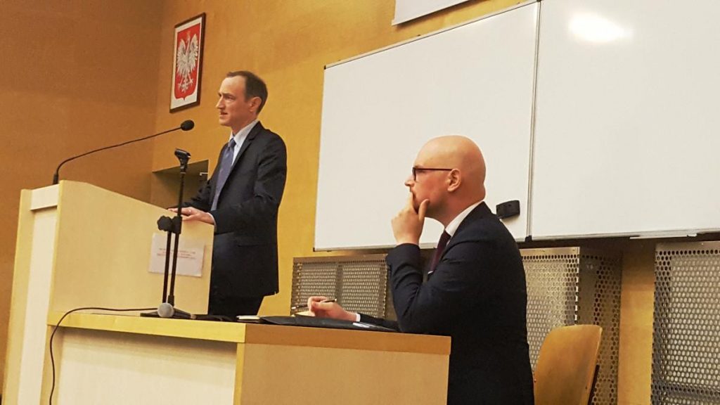 20 listopada 2017 r. odbyło się spotkanie studentów UKSW z radcami politycznymi ambasad Republiki Francuskiej oraz Republiki Federalnej Niemiec, Panami Thomasem Buffinem (na zdj. przy mównicy) i Larsem Frederikiem Geismannem, poświęcone polityce międzynarodowej reprezentowanych przez nich państw. Spotkaniu przewodniczyli: prof. Dariusz Góra-Szopiński, kierownik Katedry Regionalnych Studiów Strategicznych, oraz dr Magdalena Satora, sekretarz Katedry Historii Stosunków Międzynarodowych. Spotkanie cieszyło się dużym zainteresowaniem studentów, którzy do ostatnich rzędów wypełnili amfiteatralną aulę w budynku 23.