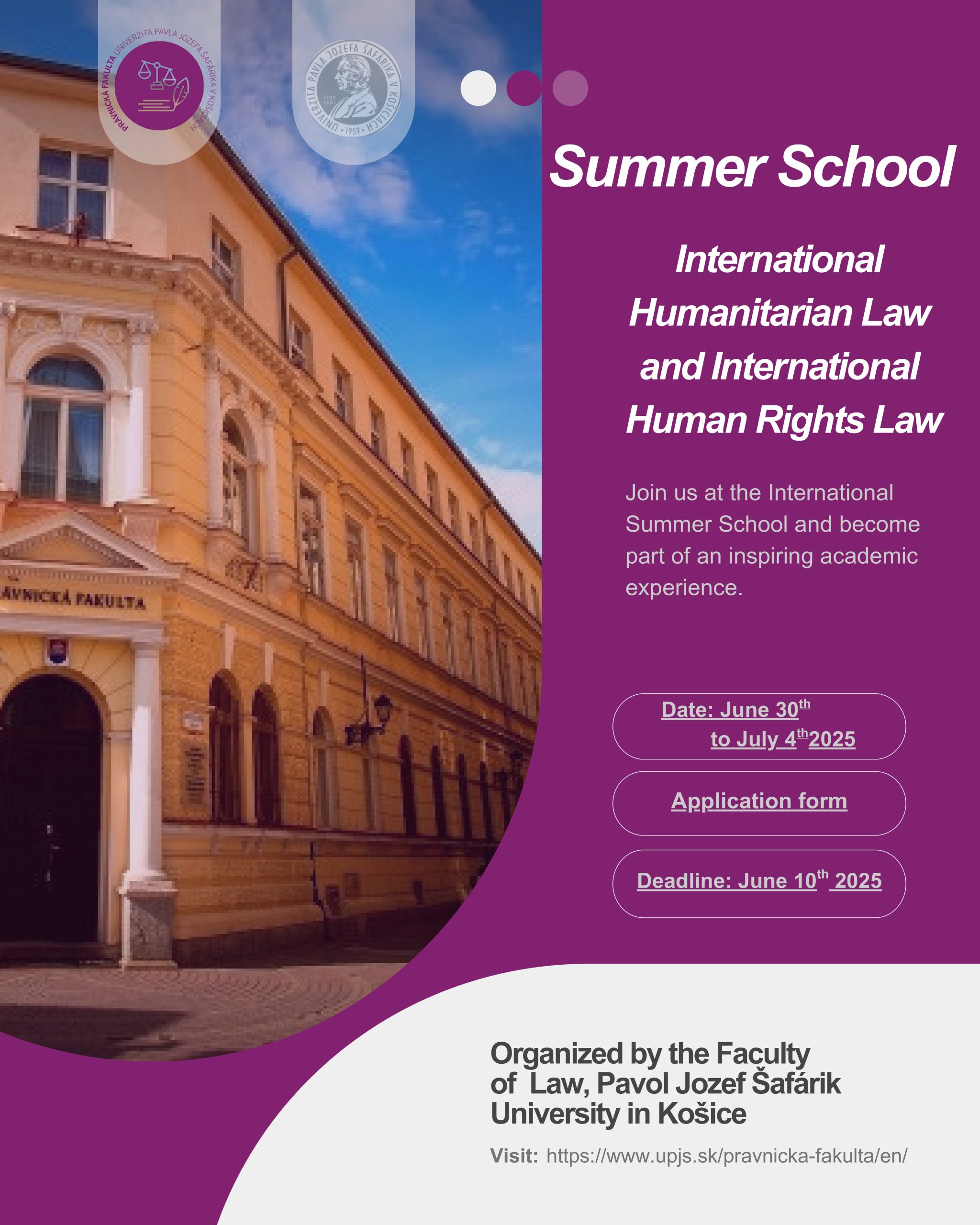 Dołącz do Letniej Szkoły Prawa Humanitarnego i Praw Człowieka 2025 na Uniwersytecie Pavla Jozefa Šafárika w Koszycach, by wziąć udział w programie edukacyjnym poświęconym aktualnym zagadnieniom prawa konfliktów zbrojnych, międzynarodowego prawa humanitarnego, prawa człowieka oraz prawa uchodźczego. Letnia Szkoła stanowi wyjątkową okazję do wzmocnienia promocji prawa humanitarnego, Konwencji Genewskich, ogólnych zasad prawa wojennego, jak również ochrony praw człowieka ludności dotkniętej konfliktami.
