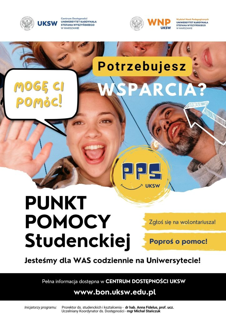 Centrum Dostępności UKSW oraz Wydział Nauk Pedagogicznych UKSW uruchamiają drugą edycję Punktu Pomocy Studenckiej (PPS). Celem programu jest wsparcie nowych studentów w pierwszym miesiącu nauki, czyli w okresie od 29 września do 24 października. Projekt ma ułatwić adaptację do życia akademickiego i codziennego.