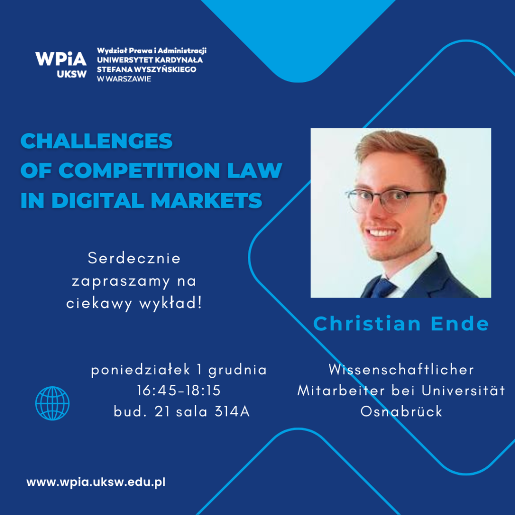 Serdecznie zapraszamy wszystkich studentów, których interesuje prawo konkurencji i rynki cyfrowe, na wykład pt. ‘Challenges of competition law in digital markets’, który poprowadzi pan Christian Ende, pracownik naukowy Universität Osnabrück. Będzie ciekawie i praktycznie!