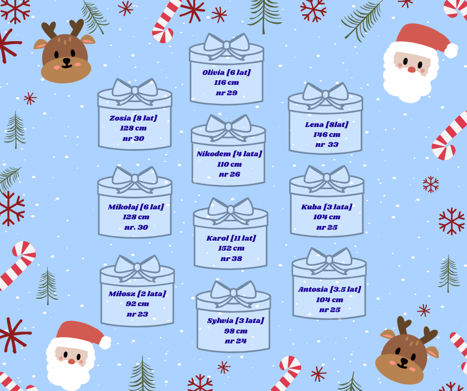Poszukujemy 10 pracowników lub 10 zespołów pracowników, którzy zechcieliby przygotować paczkę dla Lenki, Zosi, Mikołaja, Miłosza, Tosi, Olivii, Sylwii, Karola, Kuby i Nikodema.