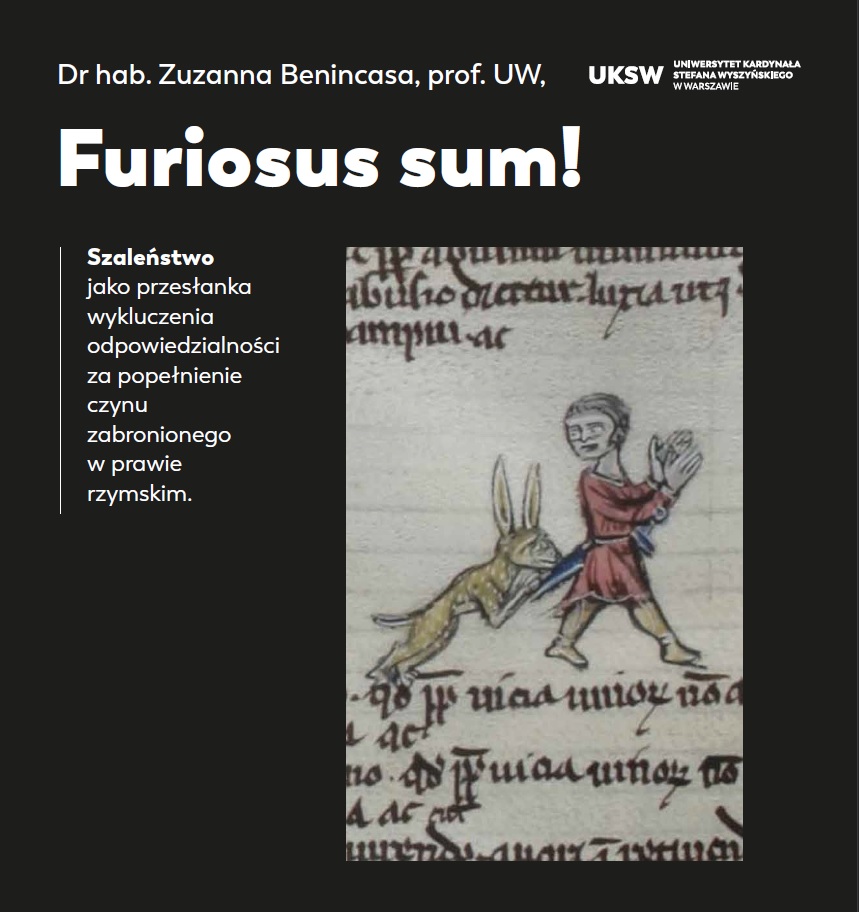 6 grudnia o 15 w Auli Schumana odbędzie się wykład Furiosus sum! Szaleństwo jako przesłanka wykluczenia odpowiedzialności za popełnienie czynu zabronionego w prawie rzymskim, który wygłosi dr hab. Zuzanna Benincasa, prof. ucz. z Uniwersytetu Warszawskiego